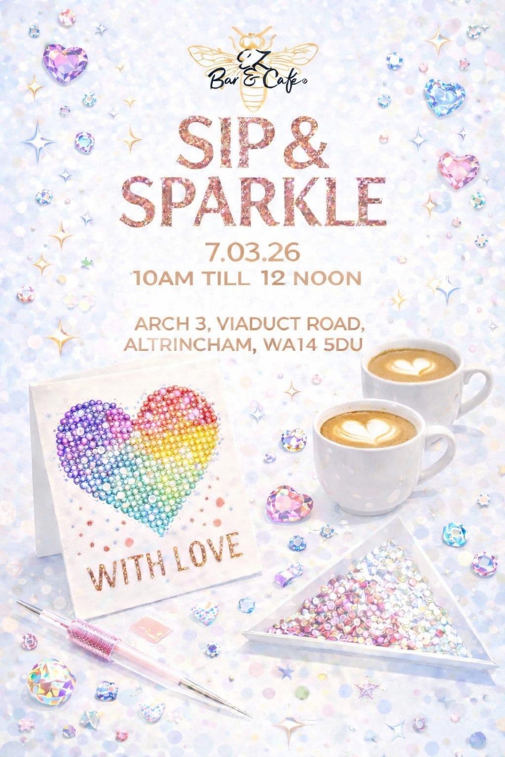 Sip & Sparkle is a relaxed, feel-good event where you can enjoy beautifully crafted coffee while creating your own dazzling artwork in a warm, welcoming space.