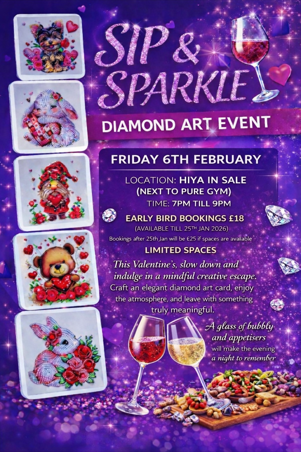 Treat yourself to an enchanting Valentine's evening of bubbly, delicious appetisers, and sparkling creativity. Create your own stunning diamond art card while connecting with fellow craft lovers in a magical atmosphere.