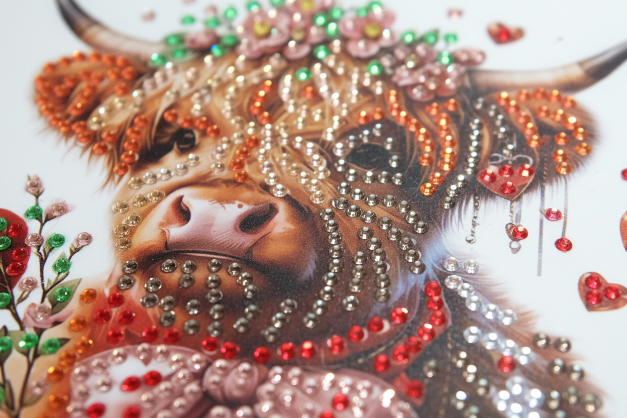 Highland Cow with a Pink Bow and a Red Heart Diamond Art Card
